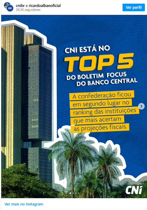 A Confederação Nacional da Indústria (CNI) ficou em segundo lugar no top 5 do Relatório Focus do Banco Central que reconhece as instituições que mais acertaram as projeções fiscais, como resultado primário e dívida bruta do governo, em 2025.
