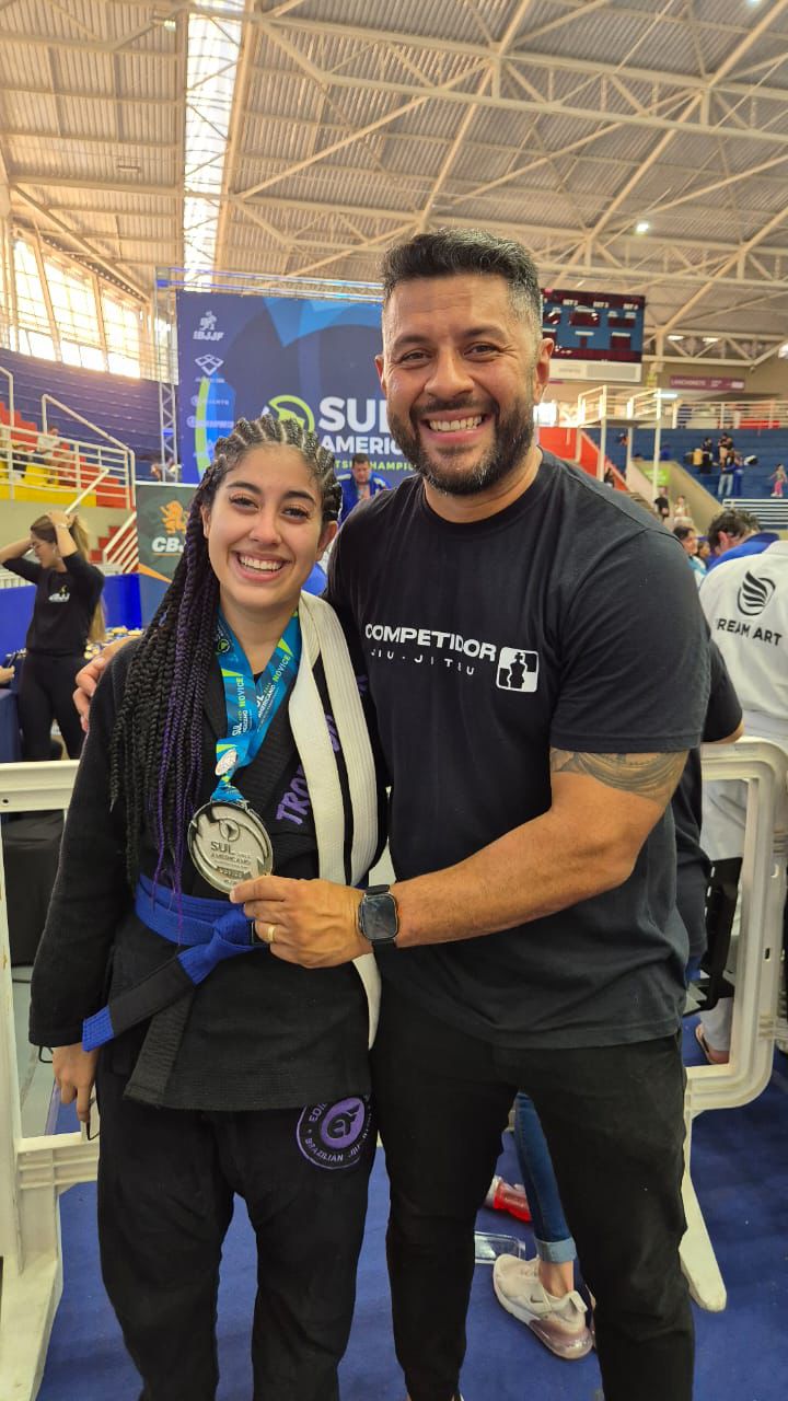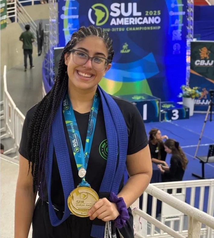 Recentemente, a jovem conquistou o 2º lugar no Campeonato Sul-Americano de Jiu-Jitsu e, no mesmo pódio, recebeu a graduação para a faixa azul, eternizando mais um momento marcante em sua trajetória.